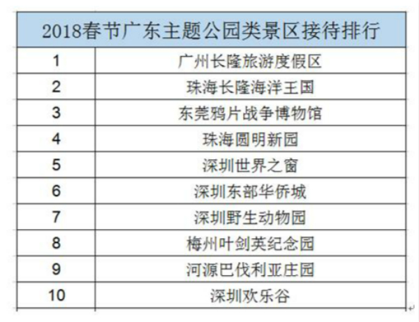 2018春节广东主题公园类景区接待排行(数据来源:全省纳入统计的111家景区)