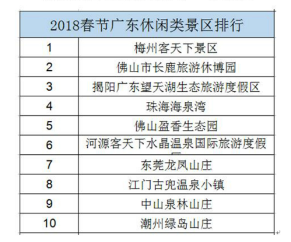 2018春节广东休闲度假类景区排行(数据来源:全省纳入统计的111家景区)