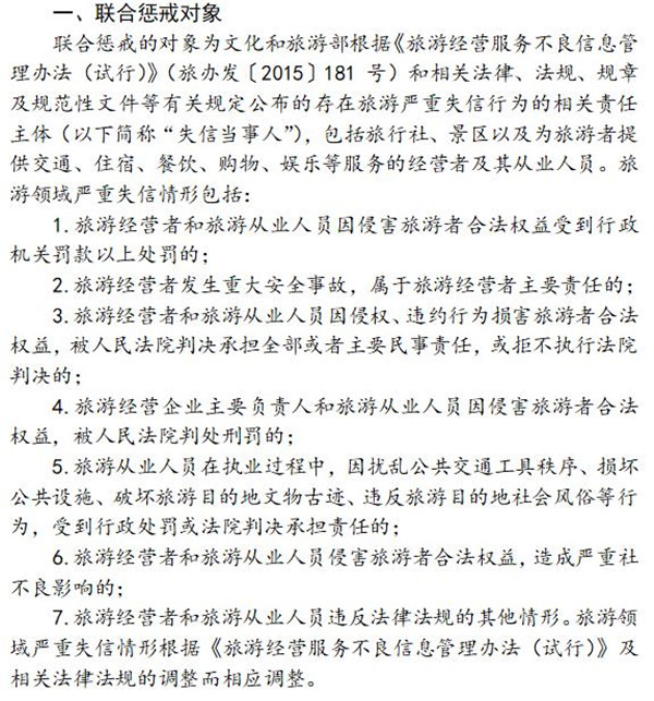 近日,国家发展和改革委员会、文化和旅游部、中央组织部、中央文明办等二十余部委联合印发《关于对旅游领域严重失信相关责任主体实施联合惩戒的合作备忘录》的通知,对旅游领域严重失信相关责任主体、惩戒对象、信息共享和联合惩戒的实施方式、联合惩戒措施、联合惩戒的动态管理等进行了明确,并对制定失信信息的使用、撤销、管理、监督的相关实施细则和操作流程等内容进行了规范和责任界定,重点整治旅游领域的失信行为。