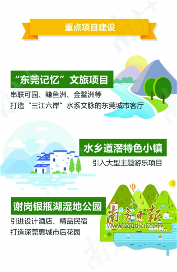 在“一心四区”全域旅游新格局上,东莞重点谋划四大示范项目:打造“东莞记忆”文旅项目,推出集步行、骑行、船行一体的历史文化旅游路线,成为东莞城市客厅;打造水乡道滘特色小镇项目,引入大型主题游乐项目;打造谢岗银瓶湖湿地公园项目,引进高端酒店、精品民宿,促进高端休闲度假消费;打造乡村振兴示范项目,建设东城周屋美丽幸福村居特色连片示范,整合开发岭南古村落旅游项目。
